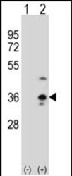 - Western blot analysis of COLEC11 (arrow) using rabbit polyclonal COLEC11 Antibody (N-term) (GTX81694). 293 cell lysates (2 ug/lane) either nontransfected (Lane 1) or transiently transfected (Lane 2) with the COLEC11 gene.