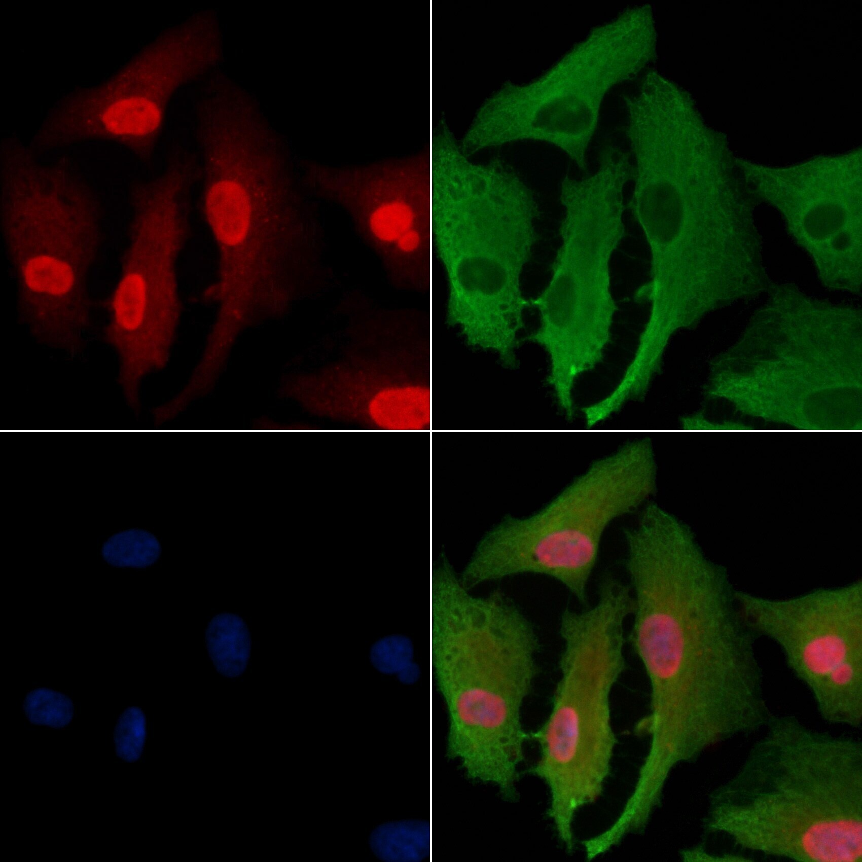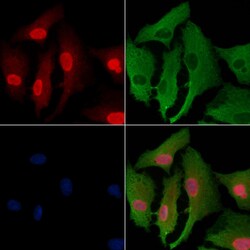 - Immunocytochemistry analysis of SGK494 in A549 cells. The samples were fixed with PFA and permeabilized in 0.1% Triton X-100, then blocked in 10% serum for 45 minutes at 25°C. Samples were incubated with SGK494 polyclonal antibody (Product # PA5-100924) and mouse anti-beta tubulin antibody for 1 hour at 37°C. An AlexaFluor594 conjugated goat anti-rabbit IgG(H+L) (Red) and an AlexaFluor488 conjugated goat anti-mouse IgG(H+L) (Green) were used as the secondary antibodies. The nuclear counter stain is DAPI (blue).