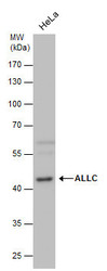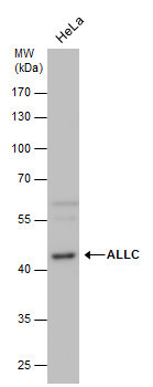 - ALLC antibody detects ALLC protein by western blot analysis. Whole cell extracts (30 £gg) was separated by 10% SDS-PAGE, and the membrane was blotted with ALLC antibody (GTX120709) diluted by 1:1000.