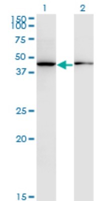 - Western Blot: ALLC Antibody (3D3) [H00055821-M07] - Analysis of ALLC expression in transfected 293T cell line by ALLC monoclonal antibody (M07), clone 3D3. Lane 1: ALLC transfected lysatE (45.6 KDa). Lane 2: Non-transfected lysate.