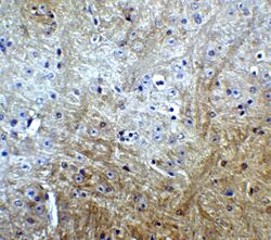- Immunohistochemistry of Slitrk1 in human brain tissue with SLITRK1 Polyclonal Antibody (Product # PA5-20470) at 2.5 µg/mL.