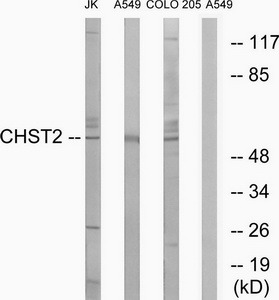 - Western blot analysis of extracts from Jurkat cells, A549 cells and COLO cells, using CHST2 antibody. The lane on the right is treated with the synthesized peptide.