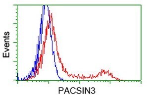 - HEK293T cells transfected with either RC204103 overexpress plasmid (Red) or empty vector control plasmid (Blue) were immunostained by anti-PACSIN3 antibody (TA502212), and then analyzed by flow cytometry.