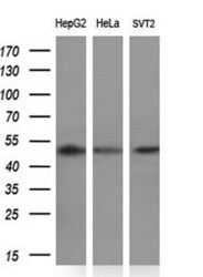 - Western blot analysis of extracts (10 µg) from 3 different cell lines by using anti-PACSIN3 monoclonal antibody. (1:200)