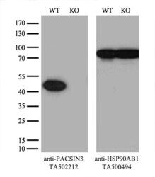 - Equivalent amounts of cell lysates (10 µg per lane) of wild-type 293T cells (WT, Cat# LC810293T) and PACSIN3-Knockout 293T cells (KO, Cat# LC812053) were separated by SDS-PAGE and immunoblotted with anti-PACSIN3 monoclonal antibody TA502212, (1:500). Then the blotted membrane was stripped and reprobed with anti-HSP90AB1 antibody (TA500494) as a loading control.