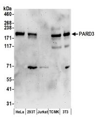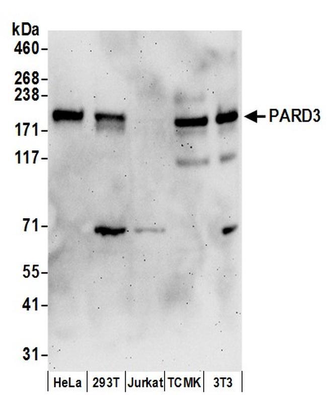 - Detection of human and mouse PARD3 by western blot. Samples: Whole cell lysate (50 µg) from HeLa, 293T, Jurkat, mouse TCMK-1, and mouse NIH3T3 cells prepared using NETN lysis buffer. Antibodies: Affinity purified rabbit anti-PARD3 antibody A304-496A (lot A304-496A-1) used for WB at 0.1 µg/ml. Detection: Chemiluminescence with an exposure time of 3 minutes.