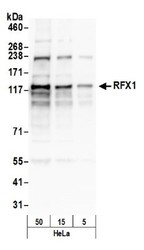 - Western Blot: RFX1 Antibody [NBP1-52654] - Detection of Human RFX1 by Western Blot. Samples: Whole cell lysate (5, 15 and 50 ug) from HeLa cells prepared using NETN lysis buffer. Antibody: Affinity purified rabbit anti-RFX1 antibody NBP1-52654 used for WB at 0.04 ug/ml. Detection: Chemiluminescence with an exposure time of 30 seconds.