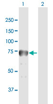 - Western Blot analysis of SAMHD1 expression in transfected 293T cell line (H00025939-T01) by SAMHD1 MaxPab polyclonal antibody.Lane 1: SAMHD1 transfected lysate(68.86 KDa).Lane 2: Non-transfected lysate.