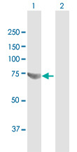 - Western Blot analysis of SAMHD1 expression in transfected 293T cell line (H00025939-T01) by SAMHD1 MaxPab polyclonal antibody.Lane 1: SAMHD1 transfected lysate(72.20 KDa).Lane 2: Non-transfected lysate.