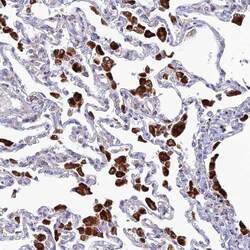- Immunohistochemical analysis of SPNS1 in human lung using SPNS1 Polyclonal Antibody (Product # PA5-59813) shows strong granular cytoplasmic positivity in macrophages.