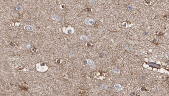 - 1:100 staining human brain carcinoma tissue by IHC-P. The sample was formaldehyde fixed and a heat mediated antigen retrieval step in citrate buffer was performed. The sample was then blocked and incubated with the antibody for 1.5 hours at 22°C. An HRP conjugated goat anti-rabbit antibody was used as the secondary.