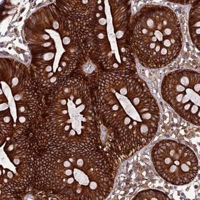 - Immunohistochemistry-Paraffin: TNIP3 Antibody [NBP1-89305] - Staining of human colon shows strong cytoplasmic and membranous positivity in glandular cells.