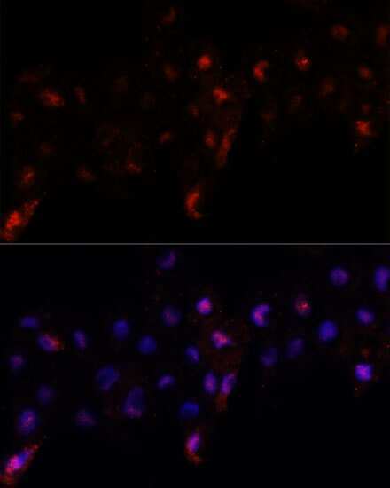 - Immunocytochemistry/Immunofluorescence analysis of PEX10 in L929 cells using PEX10 Polyclonal Antibody (Product # PA5-116706) at a dilution of 1:100. Blue: DAPI for nuclear staining.