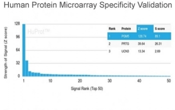 - Analysis of HuProt(TM) microarray containing more than 19,000 full-length human proteins using Phosphoglucomutase 5 antibody (clone PGM5/3552). These results demonstrate the foremost specificity of the PGM5/3552 mAb. Z- and S- score: The Z-score represents the strength of a signal that an antibody (in combination with a fluorescently-tagged anti-IgG secondary Ab) produces when binding to a particular protein on the HuProt(TM) array. Z-scores are described in units of standard deviations (SD's) above the mean value of all signals generated on that array. If the targets on the HuProt(TM) are arranged in descending order of the Z-score, the S-score is the difference (also in units of SD's) between the Z-scores. The S-score therefore represents the relative target specificity of an Ab to its intended target.