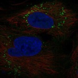 - Immunofluorescent staining of human cell line SuSa shows localization to centrosome & vesicles.