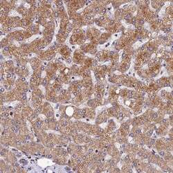 - Immunohistochemical analysis of ASPHD1 in human liver using ASPHD1 Polyclonal Antibody (Product # PA5-60942) shows moderate cytoplasmic positivity in hepatocytes.