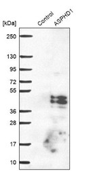 - Western Blot: ASPHD1 Antibody [NBP1-91686] - Analysis in control (vector only transfected HEK293T lysate) and ASPHD1 over-expression lysate (Co-expressed with a C-terminal myc-DDK tag (3.1 kDa) in mammalian HEK293T cells).