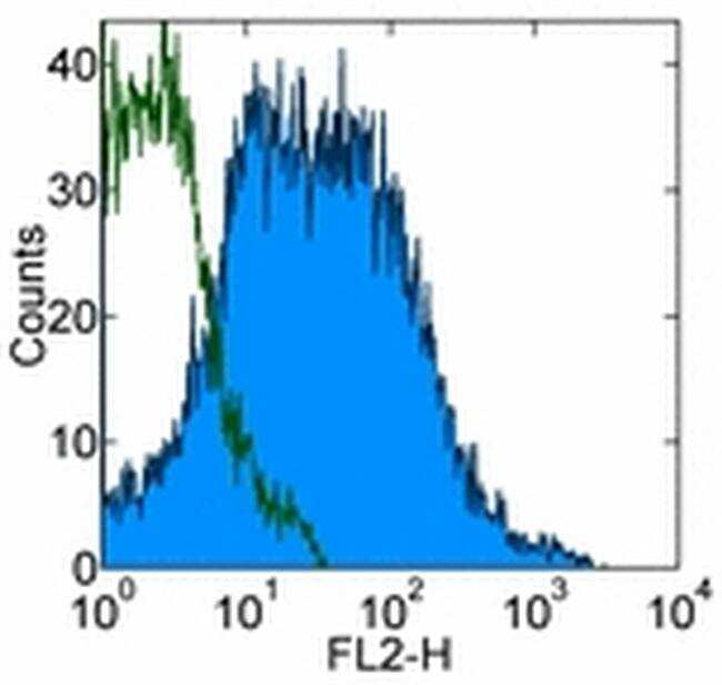 - Staining of normal human peripheral blood cells with 0.06 µg of Rat IgG2a K Isotype Control Purified (Product # 14-4321-82) (open histogram) or 0.06 µg of Anti-Human/Mouse Integrin β7 Purified (filled histogram) followed by F (ab')2 Anti-Rat IgG PE (Product # 12-4822).Cells in the lymphocyte gate were used for analysis.