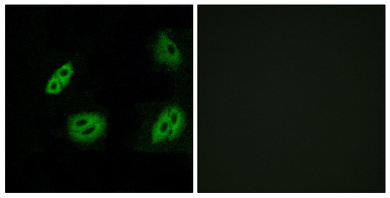 - Immunofluorescence analysis of A549 cells, using OR4B1 antibody. The picture on the right is treated with the synthesized peptide.