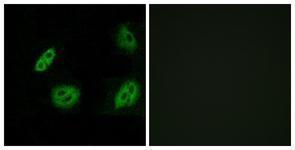 - Immunofluorescence analysis of A549 cells, using OR4B1 Antibody. The picture on the right is treated with the synthesized peptide.