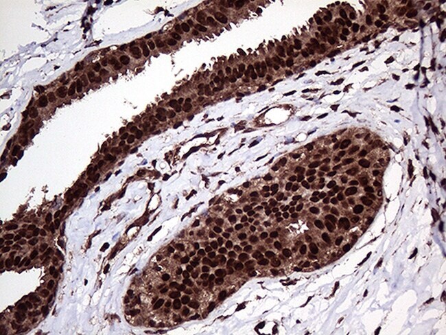 - Immunohistochemical staining of paraffin-embedded human breast tissue within the normal limits using anti-PPP4C mouse monoclonal antibody. (Heat-induced epitope retrieval by 1mM EDTA in 10mM Tris buffer (pH8.5) at 120°C for 3 min, TA810219)(1:2000).