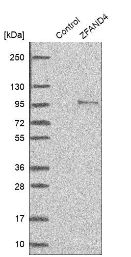 - Western blot analysis in control (vector only transfected HEK293T lysate) and ZFAND4 over-expression lysate (Co-expressed with a C-terminal myc-DDK tag (~3.1 kDa) in mammalian HEK293T cells, LY406294).