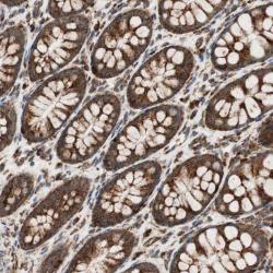 - Immunohistochemical staining of human colon shows strong cytoplasmic positivity(granular pattern) in glandular cells.