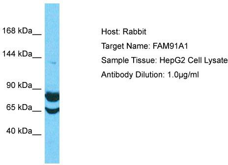 - Host: Rabbit; Target Name: FAM91A1 ; Sample Tissue: HepG2 Whole Cell lysates; Antibody Dilution: 1.0ug/ml