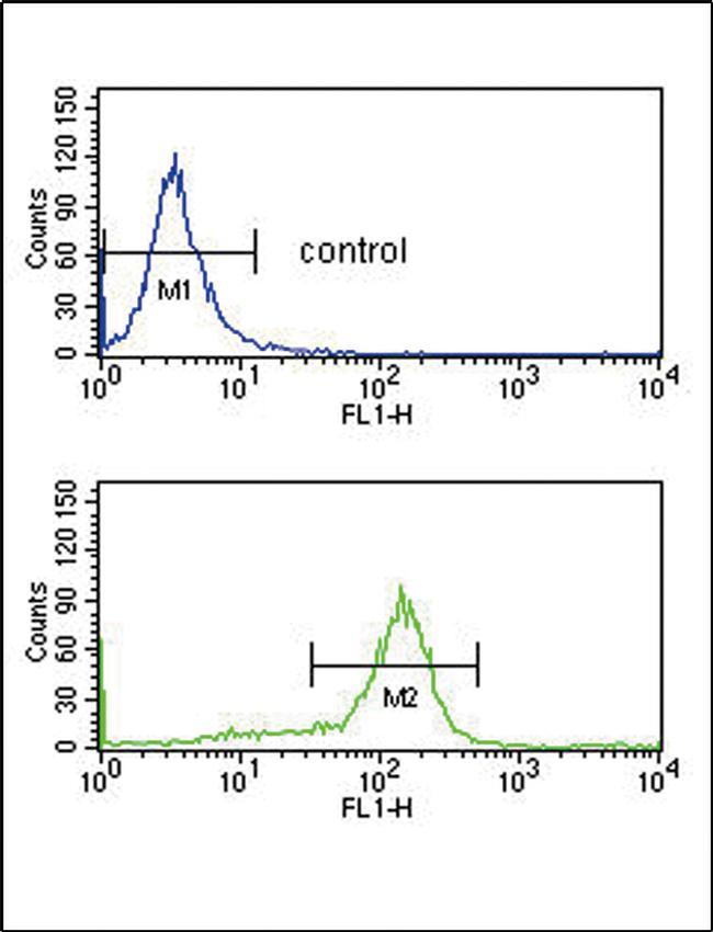 - Flow cytometry analysis of BAT1 in K562 cells (bottom histogram) compared to a negative control cell (top histogram). Samples were incubated with BAT1 polyclonal antibody (Product # PA5-72565) followed by a FITC conjugated goat anti-rabbit secondary antibody.