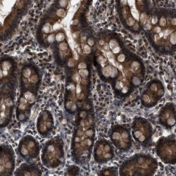 - Immunohistochemical staining of human duodenum shows nuclear and cytoplasmic positivity in glandular cells.