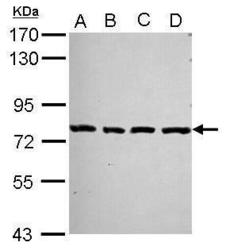- Sample (30 ug of whole cell lysate) A: NT2D1 B: IMR32 C: U87-MG D: MCF-7 7.5% SDS PAGE GTX116525 diluted at 1:5000
