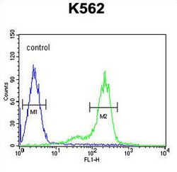 - ZN572 Antibody (C-term) flow cytometric analysis of K562 cells (right histogram) compared to a negative control cell (left histogram). FITC-conjugated goat-anti-rabbit secondary antibodies were used for the analysis