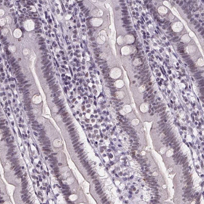 - Immunohistochemical staining of ZNF572 in human duodenum using ZNF572 Polyclonal Antibody (Product # PA5-64292) shows low expression as expected.