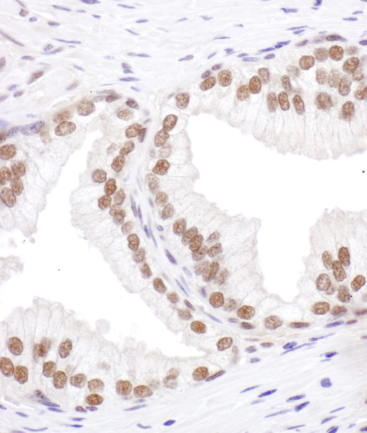 - Detection of human SRp55 by immunohistochemistry. Sample: FFPE section of human prostate carcinoma. Antibody: Affinity purified rabbit anti- SRp55 (Cat. No. A303-669A Lot1) used at a dilution of 1:1,000 (1µg/ml). Detection: DAB. Counterstain: Hematoxylin (blue).