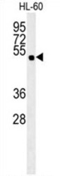 - ZNF385D Antibody (Center) (AP54699PU-N) western blot analysis in HL-60 cell line lysates (35 µg/lane). This demonstrates the ZNF385D antibody detected the ZNF385D protein (arrow).