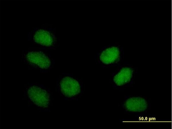 - Immunofluorescence of purified MaxPab antibody to ZNF659 on HeLa cell. Antibody concentration is 10 µg/mL.