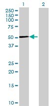 - Western Blot analysis of ZNF385D expression in transfected 293T cell line (H00079750-T01) by ZNF385D MaxPab polyclonal antibody.Lane 1: ZNF659 transfected lysate(43.45 KDa).Lane 2: Non-transfected lysate.