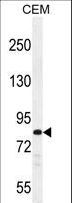 - PCDHB3 Antibody western blot of CEM cell line lysates (35 ug/lane). The PCDHB3 antibody detected the PCDHB3 protein (arrow).