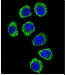 - Immunocytochemistry/Immunofluorescence: Protocadherin beta 3 Antibody [NBP2-30035] - Confocal immunofluorescent analysis of PCDHB3 Antibody (N-term)(NBP2-30035) with U-251MG cell followed by Alexa Fluor 488-conjugated goat anti-rabbit lgG (green). DAPI was used to stain the cell nuclear (blue).