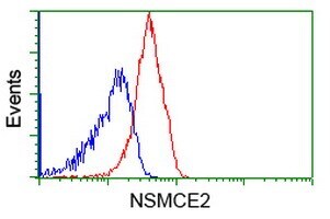 - HEK293T cells transfected with either RC207639 overexpress plasmid (Red) or empty vector control plasmid (Blue) were immunostained by anti-NSMCE2 antibody (TA501635), and then analyzed by flow cytometry.