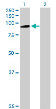 - Western Blot analysis of PCDHB7 expression in transfected 293T cell line (H00056129-T01) by PCDHB7 MaxPab polyclonal antibody.Lane 1: PCDHB7 transfected lysate(87.23 KDa).Lane 2: Non-transfected lysate.