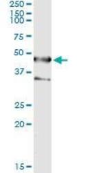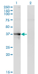 - Western Blot analysis of SEPT1 expression in transfected 293T cell line by SEPT1 monoclonal antibody (M03), clone 1F12.Lane 1: SEPT1 transfected lysate(42 KDa).Lane 2: Non-transfected lysate.