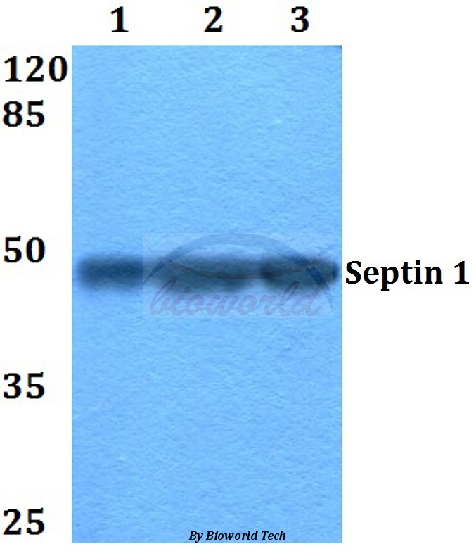 - Western blot (WB) analysis of Septin 1 (D205) pAb at 1:500 dilutionLane1:HEK293T whole cell lysateLane2:Raw264.7 whole cell lysateLane3:H9C2 whole cell lysate