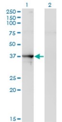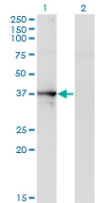 - Western Blot: Septin-1 Antibody (1F12) [H00001731-M03] - Analysis of SEPT1 expression in transfected 293T cell line by SEPT1 monoclonal antibody (M03), clone 1F12. Lane 1: SEPT1 transfected lysatE (42 KDa). Lane 2: Non-transfected lysate.