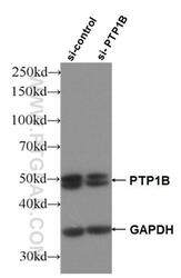 - WB result of PTP1B antibody (11334-1-AP; 1:30000; incubated at room temperature for 1.5 hours) with sh-Control and sh-PTP1B transfected Jurkat cells.