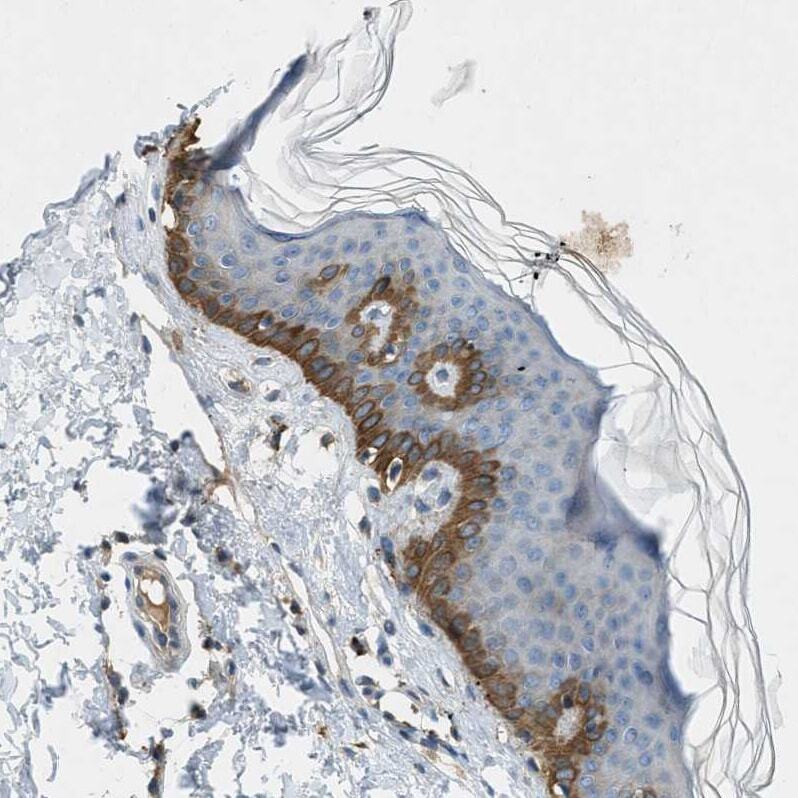 - Immunohistochemical staining of MAN2A2 in human skin using MAN2A2 Polyclonal Antibody (Product # PA5-53563) shows moderate to strong cytoplasmic positivity in epidermal cells.