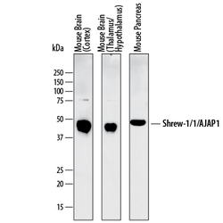 - Detection of Mouse Shrew-1/AJAP1 by Western Blot. Western blot shows lysates of mouse brain (cortex) tissue, mouse brain (thalamus/hypothalamus) tissue, and mouse pancreas tissue. PVDF membrane was probed with 1 µg/mL of Sheep Anti-Mouse Shrew-1/AJAP1 Antigen Affinity-purified Polyclonal Antibody (Catalog # AF7970) followed by HRP-conjugated Anti-Sheep IgG Secondary Antibody (Catalog # HAF016). A specific band was detected for Shrew-1/ AJAP1 at approximately 45-50 kDa (as indicated). This experiment was conducted under reducing conditions and using Immunoblot Buffer Group 1.