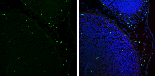 - Iba1 antibody detects Iba1 protein expression at microglias by immunohistochemical analysis.Sample: Frozen sectioned E13.5 Rat brain. Green: Iba1 protein stained by Iba1 antibody (GTX101495) diluted at 1:250.Red: beta Tubulin 3/ TUJ1, a mature neuron marker, stained by beta Tubulin 3/ TUJ1 antibody [GT11710] (GTX631836) diluted at 1:500.Blue: Fluoroshield with DAPI (GTX30920).