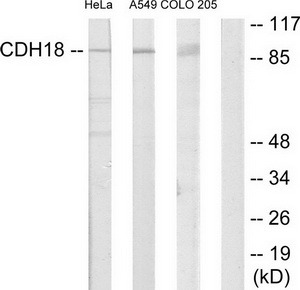 - Western blot analysis of extracts from HeLa cells, A549 cells and COLO205 cells, using CDH18 antibody. The lane on the right is treated with the synthesized peptide.