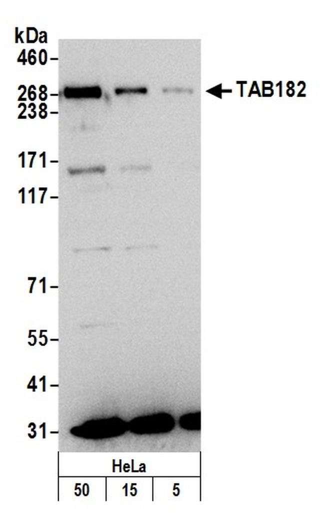 - Detection of human TAB182 by western blot. Samples: Whole cell lysate (5, 15 and 50 µg) from HeLa cells prepared using NETN lysis buffer. Antibody: Affinity purified rabbit anti-TAB182 antibody A301-439A-M (lot A301-439A-M-2) used for WB at 1:1000. Detection: Chemiluminescence with an exposure time of 3 minutes.